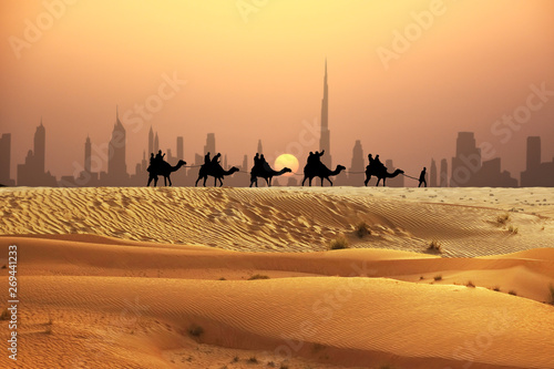 Camel Tourists Caravan Walking On Sunset Desert Near Dubai Skyline